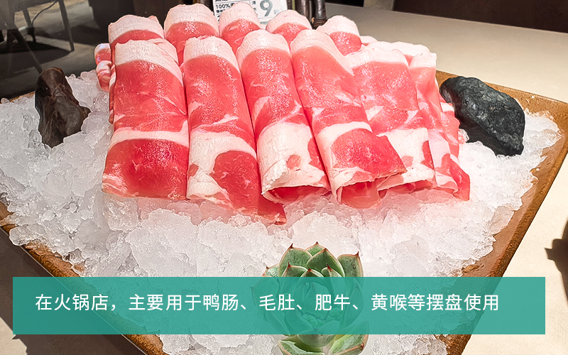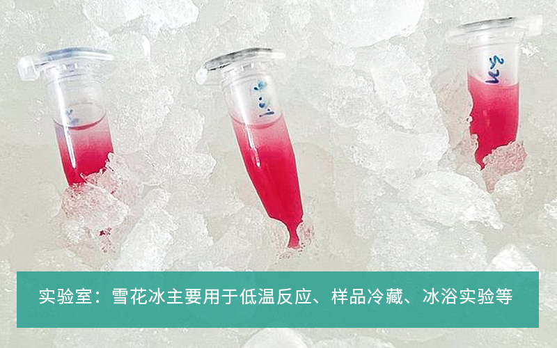 应用场景:火锅店、料理店、刺身店等:雪花冰主要用于菜品摆盘,不仅能保证食材新鲜度,同时洁白的雪花冰与鲜艳的食材完美搭配,让客户就餐的同时享受视觉盛宴;实验室:雪花冰主要用于低温反应、样品冷藏、冰浴实验等;医疗领域:雪花冰用于血浆冷藏,物理降温,标本保存等;水产海鲜:雪花冰用于降温保鲜,防止水产品因为温度过高导致变质等。