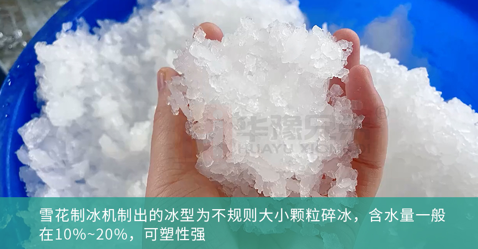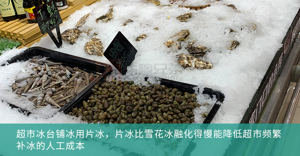 雪花制冰机制出的冰为不规则大小颗粒状,含水量一般在10%~20%,可塑性强,适合铺在超市冰台底层,能紧密贴合海鲜、肉类,起到均匀保湿的作用,但易融化、易结块,需频繁补冰,更适合超市小型冰台或高端刺身陈列。